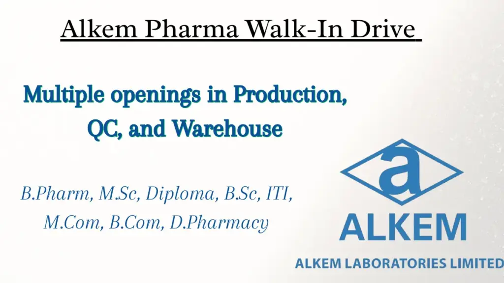 Shape up your pharma career with Alkem Laboratories, one of India’s leading pharmaceutical companies! Alkem invites skilled and passionate professionals to join its Formulation Manufacturing Facility based at Daman, with a Walk-In Interview scheduled in Goa on 12th October 2025 (Sunday). This is an exciting opportunity for candidates from B.Pharm, M.Sc, Diploma, B.Sc, ITI, and Commerce backgrounds to be part of a global healthcare innovator committed to quality, science, and excellence.