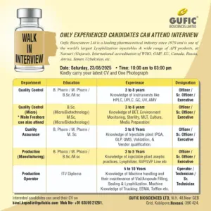 Gufic Biosciences walk-in on 23rd Aug 2025 at Navsari, Gujarat. Openings in QC, QA, Production, Microbiology. Experienced candidates apply now!