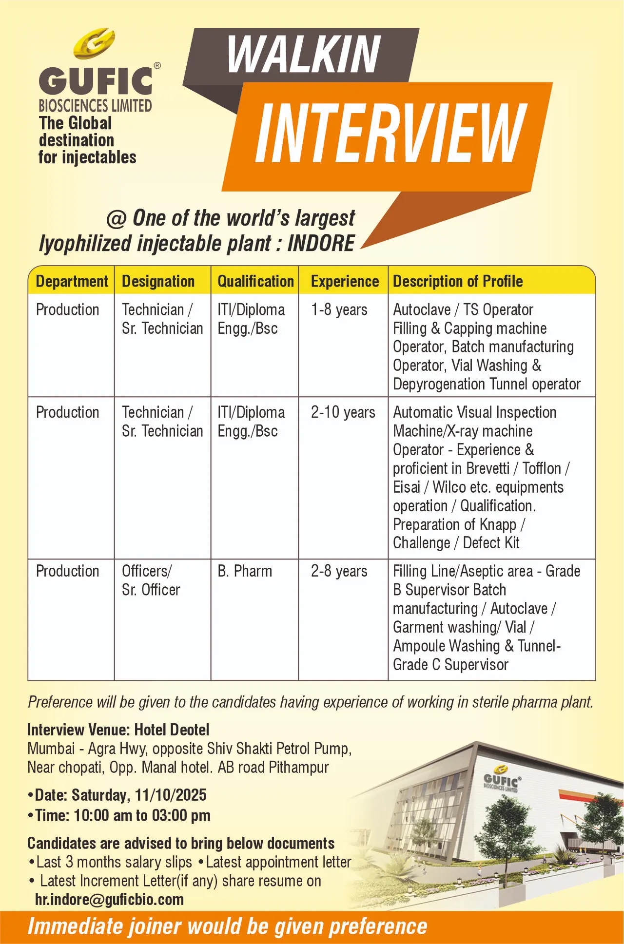 Gufic Biosciences hiring Production & QA Officers, Technicians. Walk-In Drive on 11th Oct 2025 in Indore. Apply with documents. sydney sweeney tits Gufic Biosciences Ltd, one of the world’s largest lyophilized injectable plants, is conducting a Walk-In Recruitment Drive for talented professionals passionate about pharmaceutical manufacturing and quality assurance. This is a unique opportunity to join a globally recognized organization that emphasizes innovation, operational excellence, and regulatory compliance.