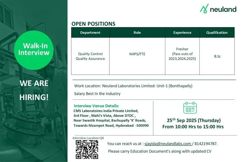 Neuland Laboratories Limited is conducting a walk-in interview for B.Sc freshers seeking careers in Quality Control (QC) and Quality Assurance (QA). This is an excellent opportunity for candidates from the 2023, 2024, and 2025 batches to join one of India’s leading pharmaceutical companies and begin their professional journey in a world-class research and manufacturing environment.