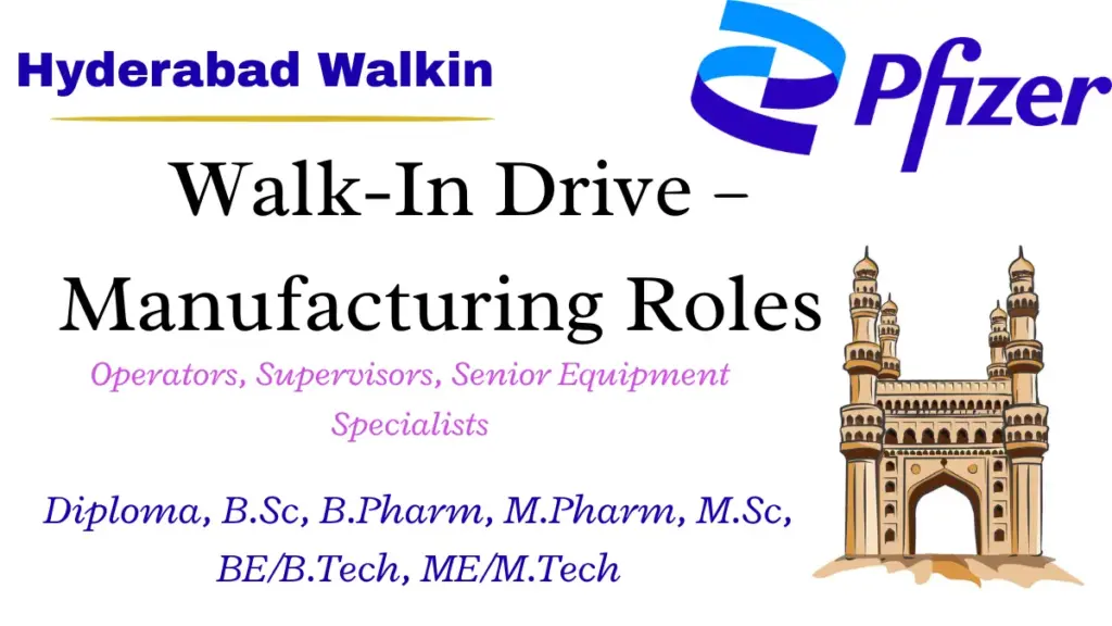 Attend Pfizer Walk-In Drive in Hyderabad on Sep 21, 2025, for Manufacturing roles. Openings for Operators, Supervisors, and Equipment Specialists.